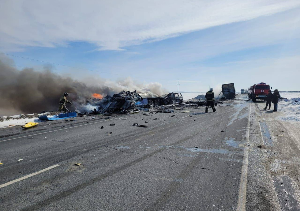 В районе 565-го километра автодороги Тюмень — Омск произошло столкновение двух большегрузов и легкового автомобиля с последующим их возгоранием. В результате ДТП, по предварительным данным, пять человек погибли, еще трое — пострадали. Личности всех участников столкновения в настоящее время устанавливаются, — сообщили в полиции.