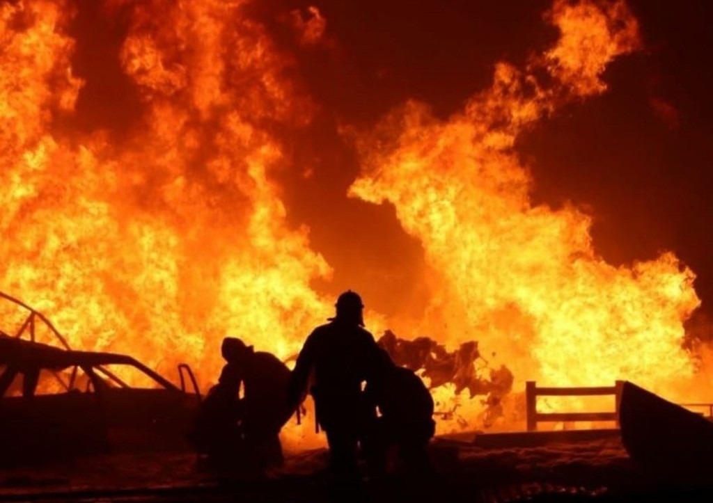 На многих кадрах видно виден густой черный дым, который тянется к небу и зарево пожара.