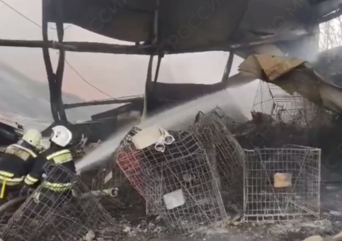 Отмечается, что на 2500 «квадратах» произошло обрушение кровли. Внутри помещения находятся газовые баллоны, что осложняет тушение. Специалисты лаборатории анализируют пробы воздуха.