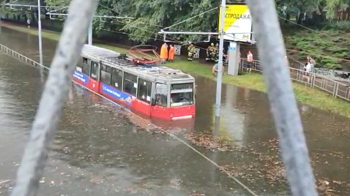На Севастопольской улице, где в низине вода скапливается почти после каждого сильного дождя, практически наполовину оказался затоплен трамвай. Из салона были вызволены десять пассажиров и вагоновожатый, сообщают местные СМИ.