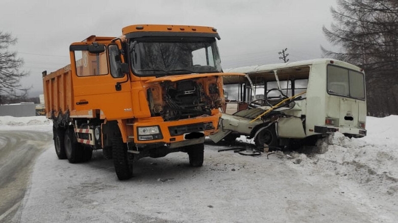 Инцидент произошел утром 23 декабря на 2-м километре автодороги. Водитель самосвала не справился с управлением, из-за чего врезался в пассажирский автобус. Всего в нем находилось 29 человек.