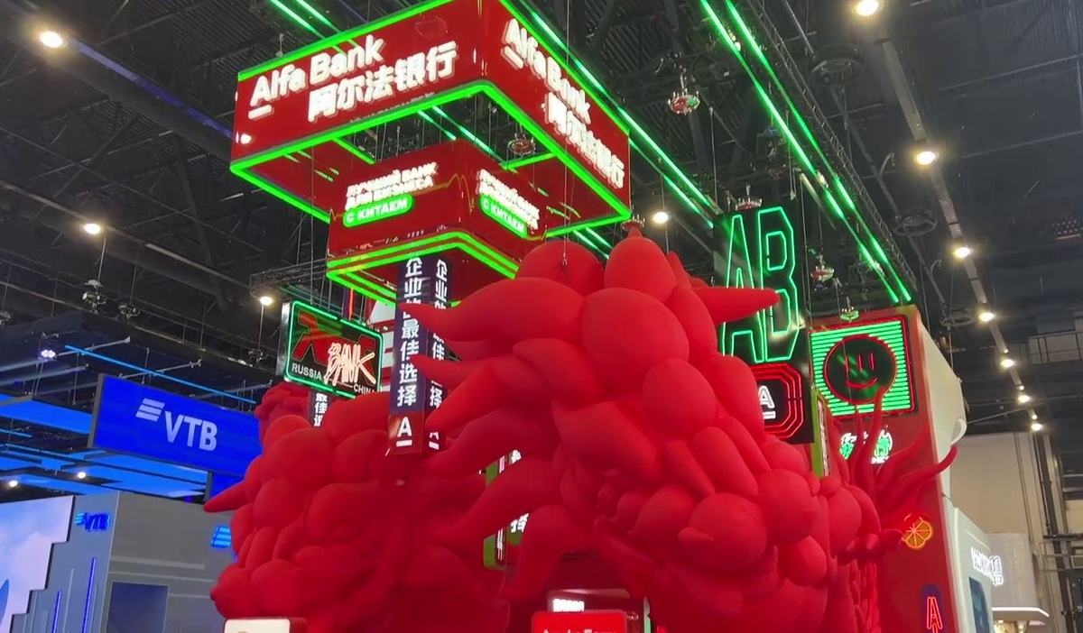 На видео заметно, что стенд Альфа-Банка выполнен в ярко-красном цвете и украшен объемными фигурами драконов. Также на экспозиции можно заметить надписи на китайском языке.