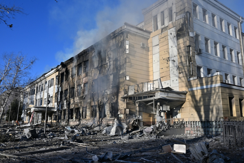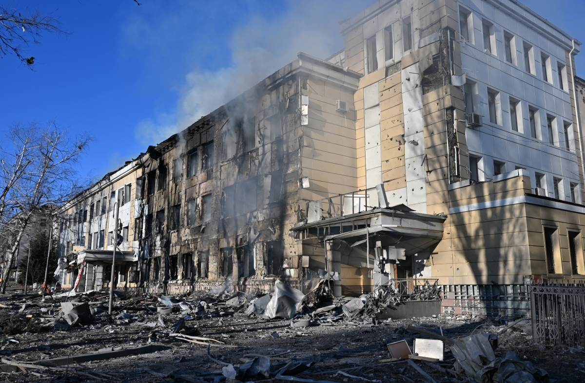 На кадрах можно заметить, что фасады здания окрасились в черный цвет из-за взрывов. Помимо этого, видно, что в больнице выбиты окна, а внутри здания обрушился потолок.