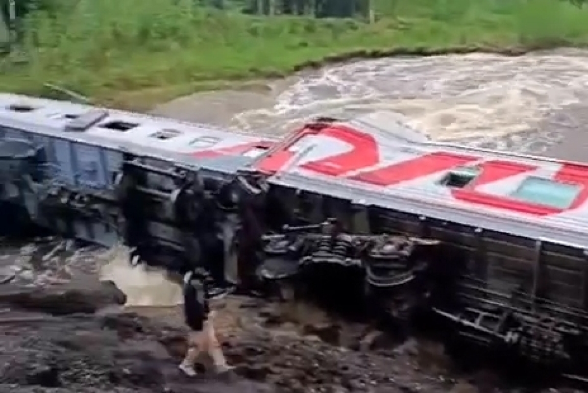 Telegram-канал Mash опубликовал видео с места схода поезда с рельсов в Коми. На кадрах видно, что пути размыты, вокруг все в воде.