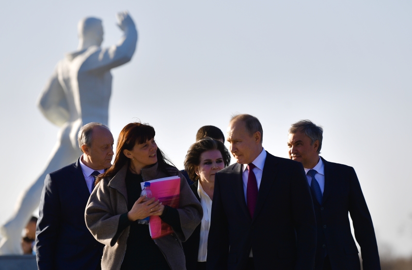 На кадрах, показанных в эфире телеканала «Россия 24», видно, что следом за Путиным к памятнику идут спикер Госдумы Вячеслав Володин и первая в мире женщина-космонавт, депутат Госдумы Валентина Терешкова.