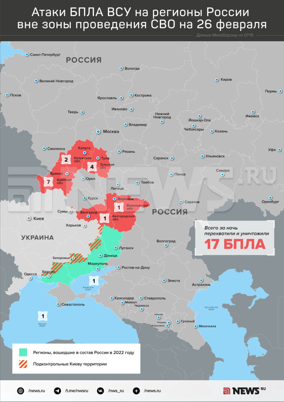 Ранее сообщалось, что 25 февраля в период с 20:00 до 23:00 мск ПВО сбила 60 украинских БПЛА над российскими регионами. Больше всего дронов было уничтожено над территорией Республики Крым — 27 штук. Еще 17 — над Белгородской областью.