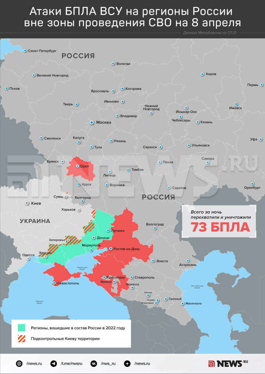В течение прошедшей ночи, с 20:00 мск 7 апреля до 07:00 мск 8 апреля, дежурными средствами ПВО уничтожены и перехвачены 73 украинских беспилотных летательных аппарата самолетного типа, — говорится в сообщении.