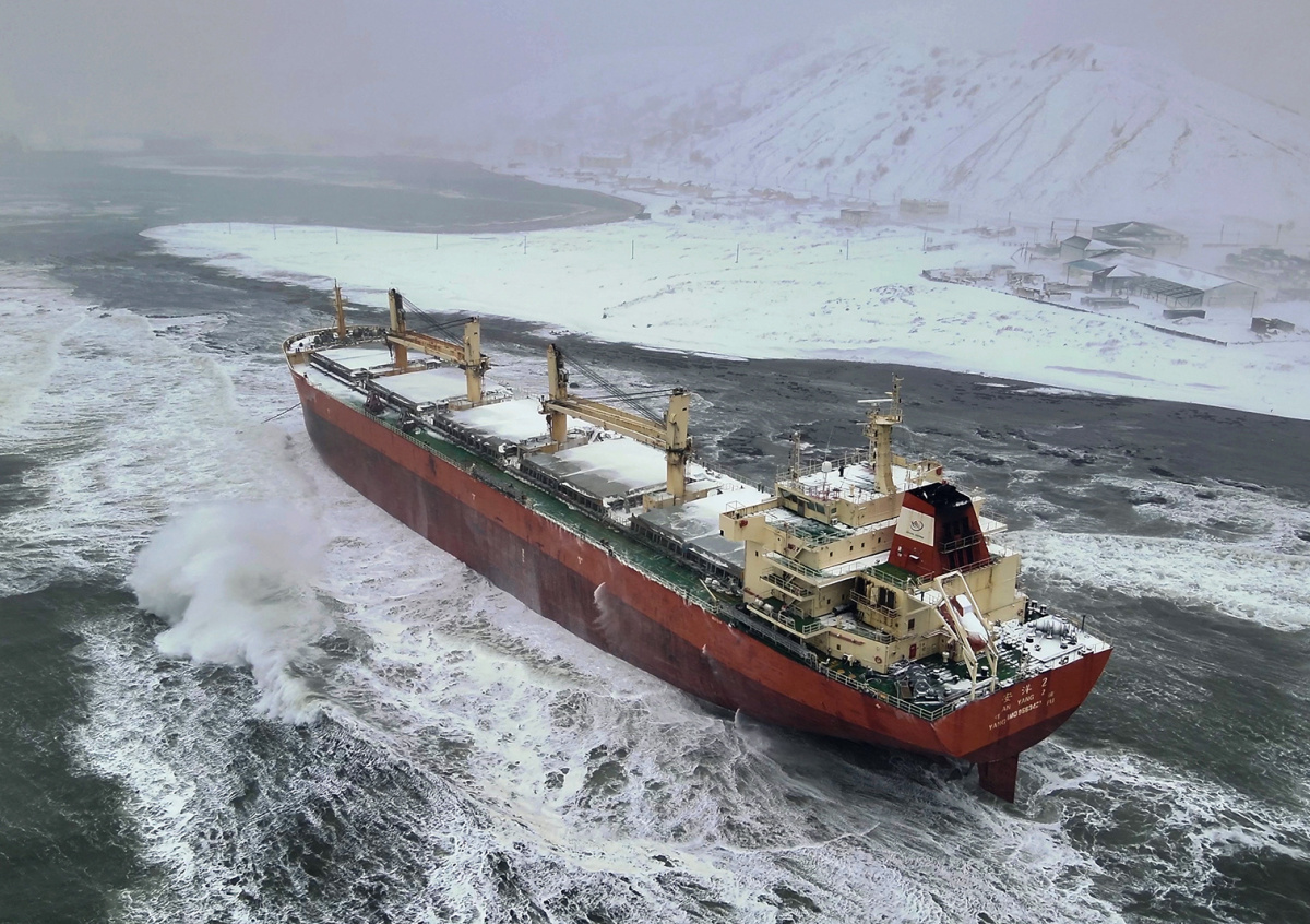 Грузовой балкер утром 9 февраля сел на мель около Сахалина из-за сильного шторма. На борту находятся 20 человек экипажа, в медицинской помощи они не нуждаются, у них есть необходимые запасы еды.