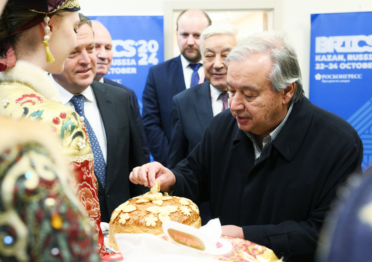 На второй день саммита, 23 октября, в Казань для участия в саммите БРИКС прилетел генеральный секретарь Организации Объединенных Наций (ООН) Антониу Гутерриш. В аэропорту его встретили председатель республиканского госсовета Фарид Мухаметшин и мэр Казани Ильсур Метшин. Гутерриша угостили татарским чак-чаком и русским хлебом-солью.