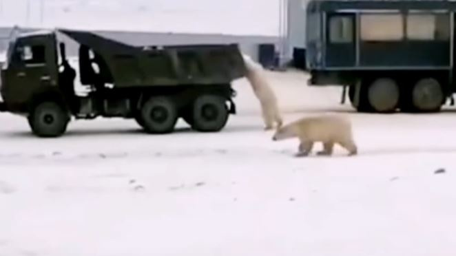 Четыре белых медведя устроили погоню за грузовиком в Якутии. Видеозапись преследования опубликовали во «ВКонтакте».