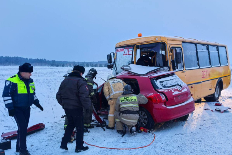 По предварительным данным, школьный автобус столкнулся с легковым автомобилем. Погибла водитель этой машины, женщина 1987 года рождения. Она скончалась до приезда медиков.