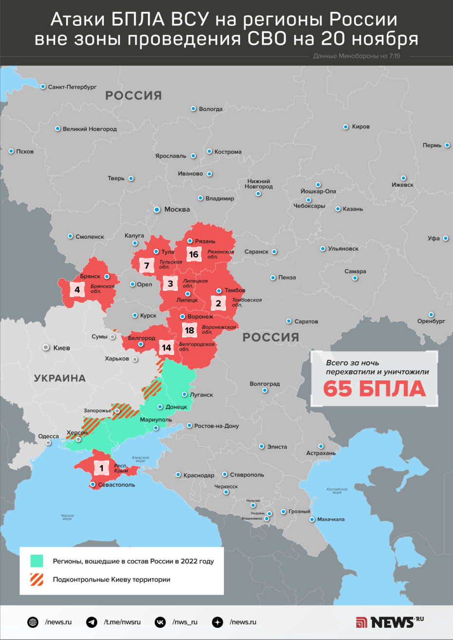 Силы противовоздушной обороны в ночь на 20 ноября уничтожили более 60 украинских беспилотников в небе над Россией, заявили в пресс-службе Министерства обороны РФ. По информации ведомства, атаке с воздуха подверглись восемь регионов страны.