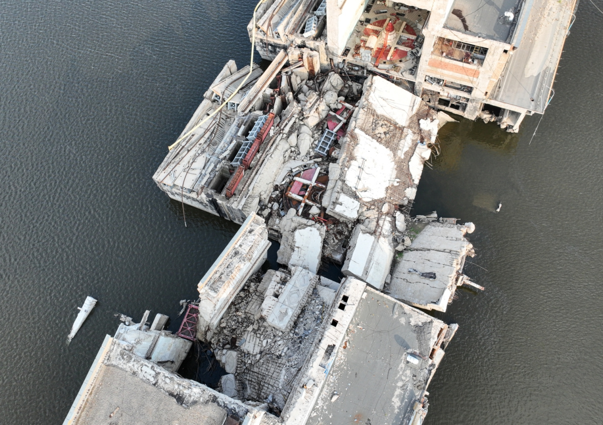 Вид на разрушенную Каховскую ГЭС Вид на разрушенную Каховскую ГЭС Фото: Пресс-служба Минобороны РФ/ТАСС