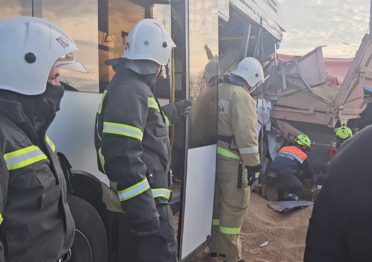 Тем временем в Сети опубликовали кадры с места смертельной аварии с участием пассажирского автобуса. На них видно, что автобус протаранил прицеп грузовика, который был загружен песком. На месте работают экстренные службы, пострадавшим оказывают медпомощь.