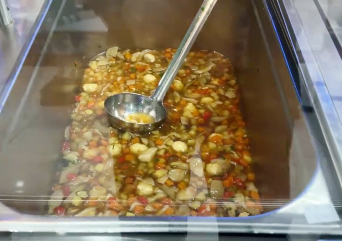 Также в меню значатся блюдо кавказской кухни аджапсандали, булгур с печеными овощами, запеченная говядина с соусом демиглас, запеченный картофель с ароматными травами. Еще в столовой можно угоститься итальянским супом минестроне. Из десертов в меню значится фисташковый торт, а из напитков — ягодный морс и яблочный сок.