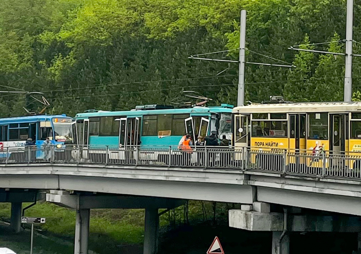 ДТП с двумя трамваями произошло 6 июне на Логовом шоссе в Кемерово. По предварительным данным, у одного из составов отказали тормоза. Он разогнался и врезался в идущий впереди трамвай.