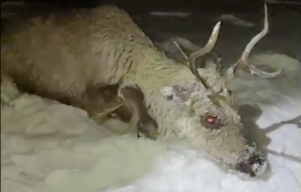 Ведомство опубликовало видео с места происшествия. В начале ролика видно, как олень безуспешно пытается выбраться из воды, а затем, уже спасенный работниками Бурприродназора, лежит на снегу. Через некоторое время он поднялся и ушел.