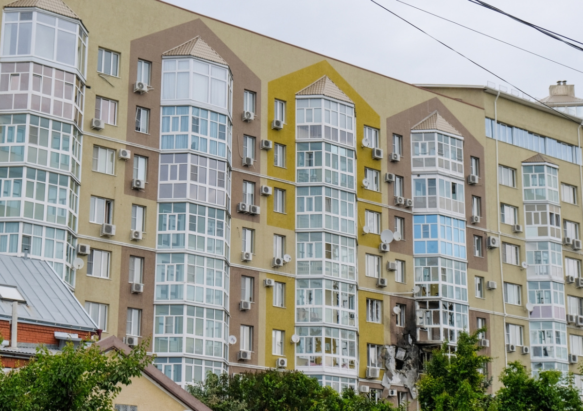 Чуть позже очевидцы опубликовали фото с места атаки беспилотника. На кадрах видны повреждения от взрыва БПЛА на одном из балконов многоэтажки. Местные власти уточнили, что в 10 квартирах зафиксированы разрушения.
