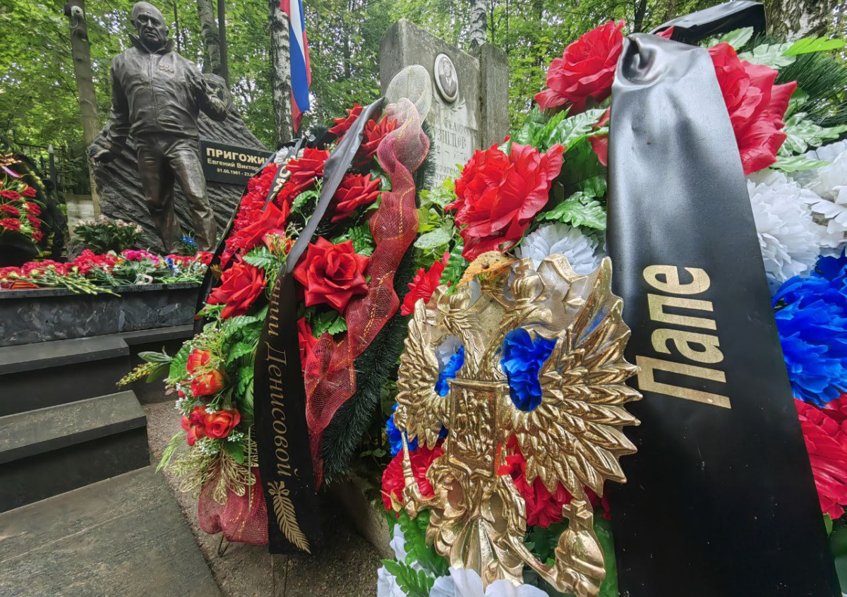 Сегодня, 23 августа, у могилы основателя ЧВК «Вагнер» Евгения Пригожина на Пороховском кладбище в Санкт-Петербурге собираются люди, чтобы почтить его память в день годовщины смерти. В распоряжении NEWS.ru оказались кадры с места событий, на которых видно, что мемориал, несмотря на дождливую погоду, усыпан свежими цветами и венками, их количество продолжает увеличиваться.