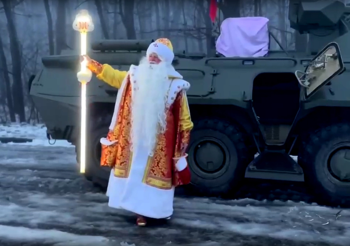 Жители Белгорода заметили в городе мужчину в костюме Деда Мороза, едущего на бронетранспортере в сторону Соборной площади, сообщает MK.RU. По словам очевидца, сказочный персонаж собирается зажечь елку, а в центр города его везут «русские воины».