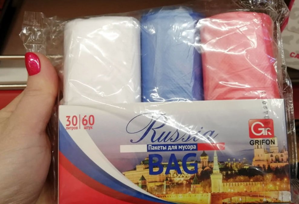 В мае в соцсетях Магадана появилась фотография упаковки с мусорными пакетами. Жители возмутились, что рулоны в цветах российского флага, да ещё и Кремль на упаковке, и пожаловались силовикам. Колымские полицейские обратились к коллегам из Новосибирска, где зарегистрирована компания, производящая мешки.