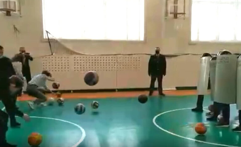 Школьники закидывают баскетбольными мячами сотрудников ОМОНа, которые защищены щитами. Как видно на видео, опубликованном в группе телеканала «Мегаполис» в соцсети «ВКонтакте», после этого одного из полицейских, который вместе с остальными учениками кидал мячи, «задерживают».