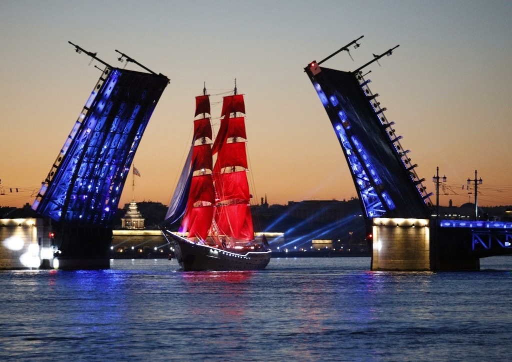 В Санкт-Петербурге прошел праздник для выпускников «Алые паруса». Кульминацией события стал проход брига «Россия» по Неве с алыми парусами.