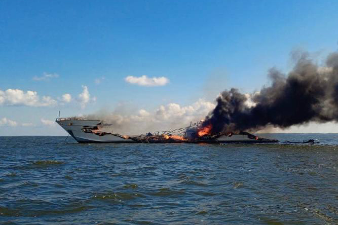 Ведомство начало доследственную проверку по статье 263 УК РФ (нарушение правил безопасности на водном транспорте, повлекшее крупный ущерб). Размер причиненного ущерба пока устанавливается. На опубликованных фотографиях видно, что надводная часть судна практически полностью уничтожена огнем. Следственные органы продолжают выяснять обстоятельства происшествия и точные причины возгорания.