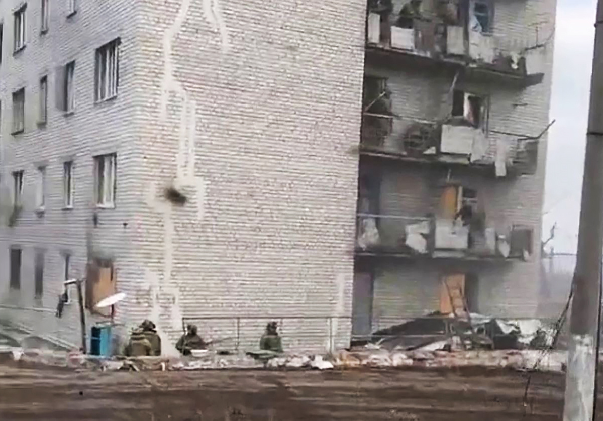 На кадрах съемки видно, что вокруг здания вырыты окопы, ведущие в подвал. На балконах почти на каждом этаже дежурят украинские военные с оружием.
