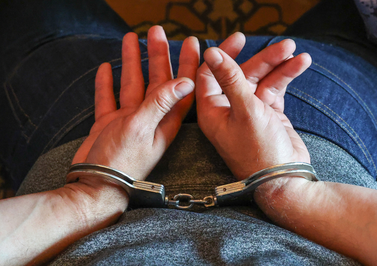 Молодого человека застали дома в одном нижнем белье. Через склейку показано, как его, уже одетого и закованного в наручники, выводят их квартиры лицом вниз и доставляют в отдел.