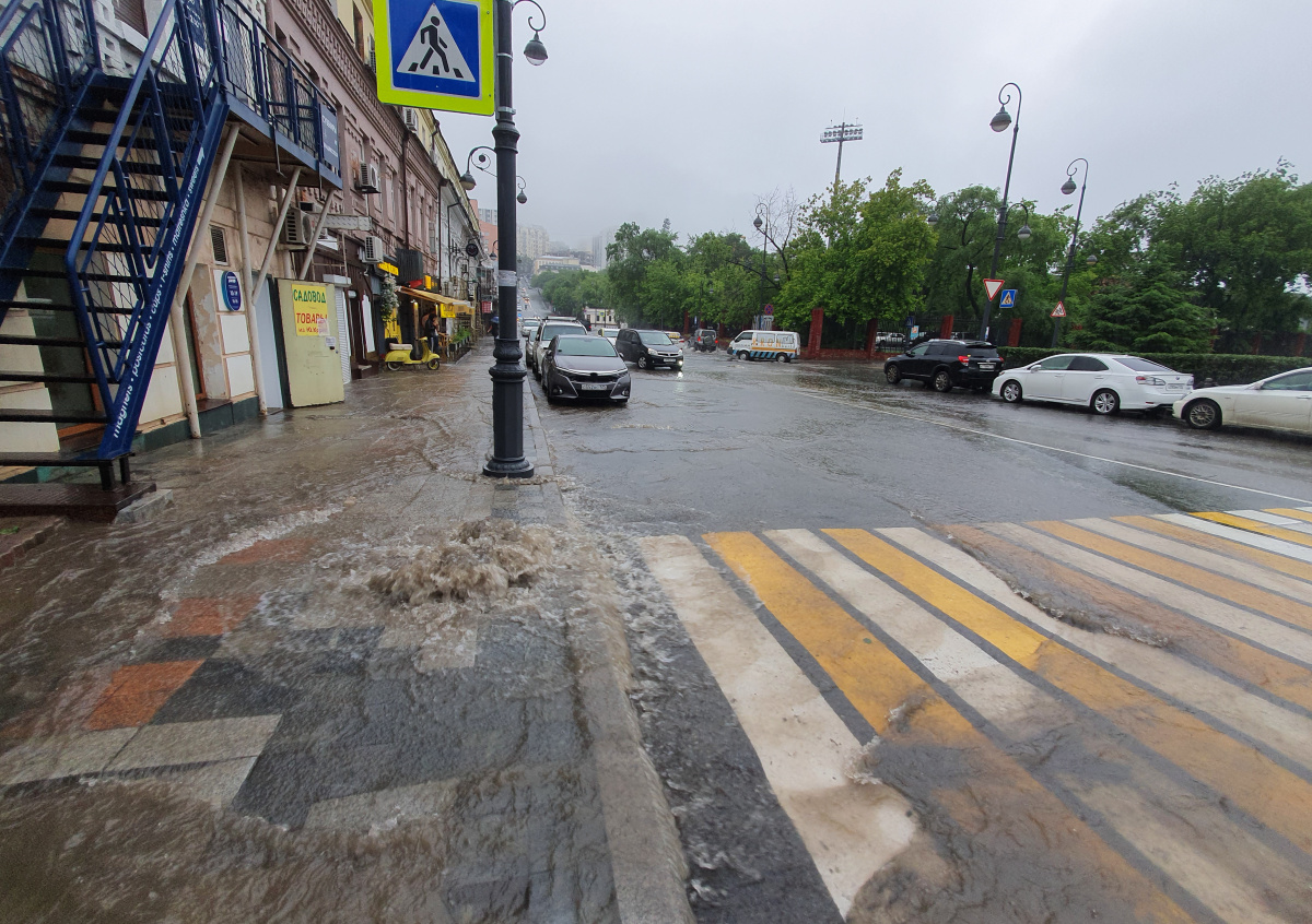 На одной из затопленных улиц Владивостока молодой человек устроил настоящее шоу на аквабайке, пишет vostokmedia.com. Очевидцы засняли, как он выводит круги по мутной воде. Ранее на город обрушилась водная стихия — некоторые улицы затопило настолько, что припаркованные автомобили полностью накрыло водой.
