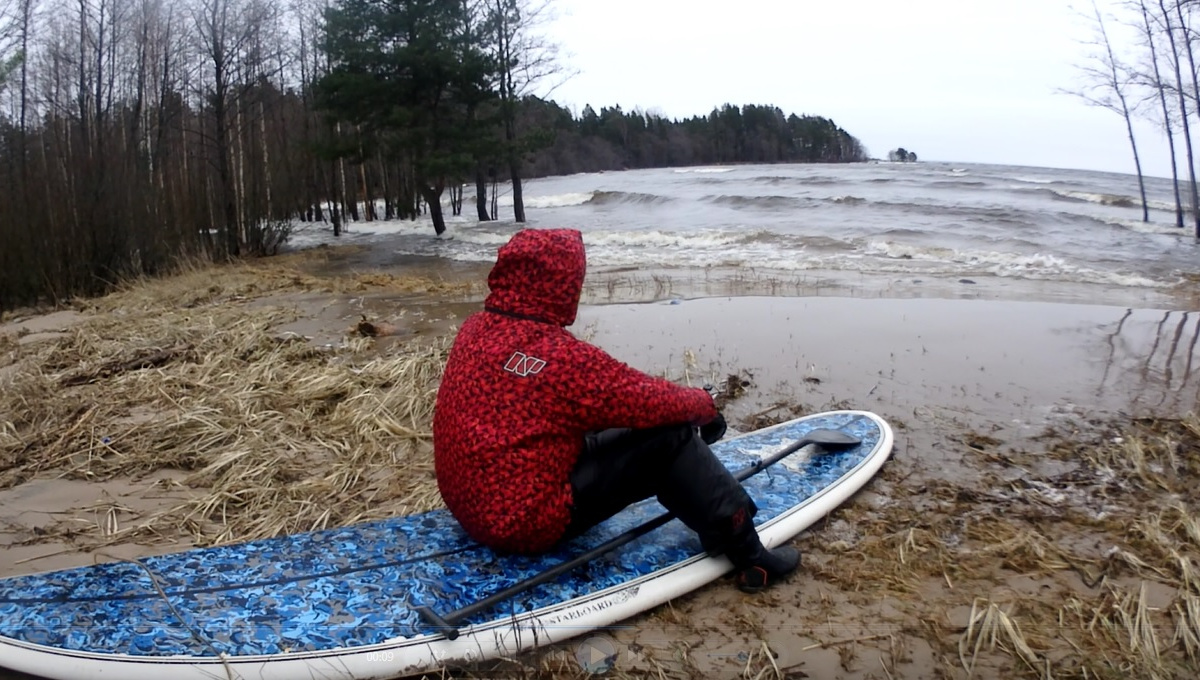 Мужчина воспользовался бушевавшим штормом и устроил сёрфинг по затопленному лесу на берегу Финского залива в Петербурге.