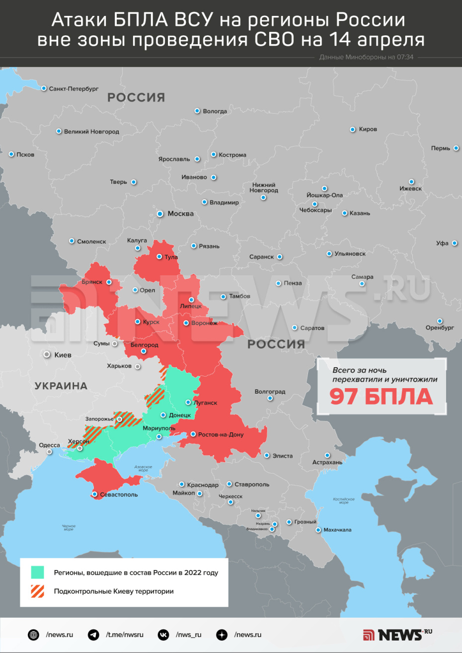 Карта атак БПЛА ВСУ на регионы РФ на 14 апреля: инфографика