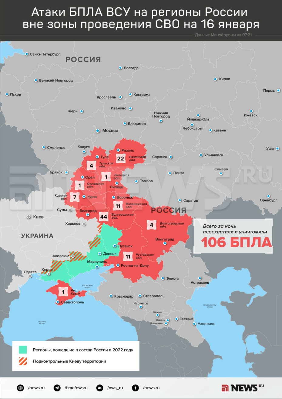 В ночь на 16 января Вооруженные силы РФ пресекли попытки украинской армии совершить атаки с применением БПЛА самолетного типа на объекты на российской территории, говорится в сообщении, опубликованном в Telegram-канале Минобороны РФ. Дежурные средства ПВО перехватили и уничтожили 106 дронов противника. Над какими регионами были сбиты беспилотники Вооруженных сил Украины — в инфографике NEWS.ru.