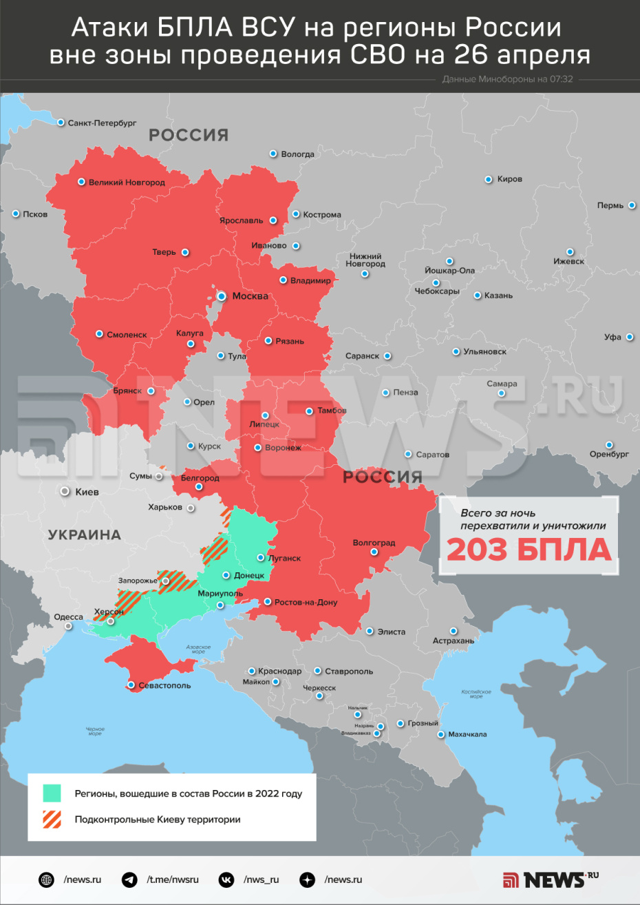 «В течение прошедшей ночи в период с 20:00 мск 25 апреля текущего года до 07:00 мск 26 апреля дежурными средствами ПВО перехвачены и уничтожены 203 украинских беспилотных летательных аппарата самолетного типа над территориями Белгородской, Брянской, Вологодской, Владимирской, Воронежской, Калужской, Липецкой, Новгородской, Ростовской, Рязанской, Смоленской, Тамбовской, Тверской, Ярославской областей, Московского региона, Республики Крым и над акваторией Черного моря», — сообщили в МО РФ.