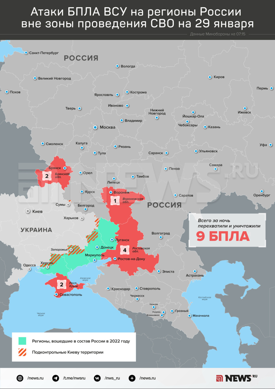 Карта атак БПЛА ВСУ на регионы РФ на 29 января: инфографика