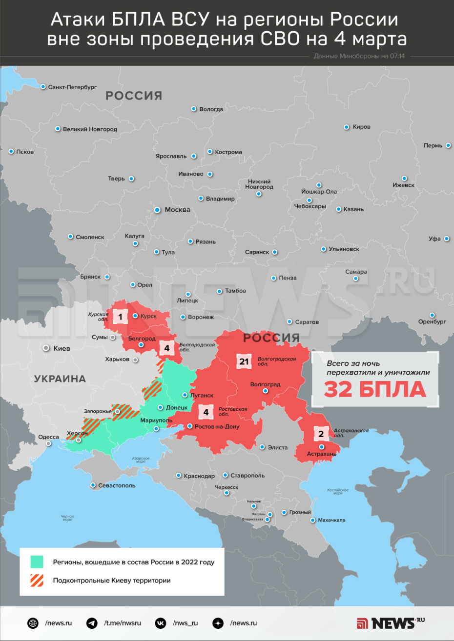 «В течение прошедшей ночи в период с 23:00 мск 3 марта до 7:00 мск 4 марта дежурными средствами ПВО перехвачены и уничтожены 32 украинских беспилотных летательных аппарата самолетного типа: 21 БПЛА — над территорией Волгоградской области, по четыре БПЛА — над территориями Ростовской и Белгородской областей, два БПЛА — над территорией Астраханской области и один БПЛА — над территорией Курской области», — рассказали в Минобороны.