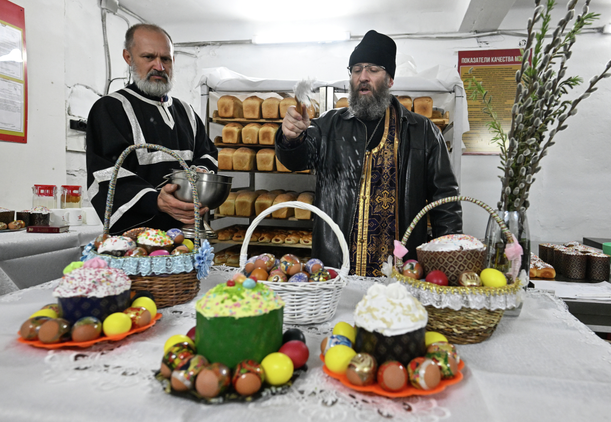 Освящение пасхальных куличей, выпеченных военными пекарями группировки войск «Центр». Куличи отправят штурмовикам на передовые позиции на Добропольском направлении СВО