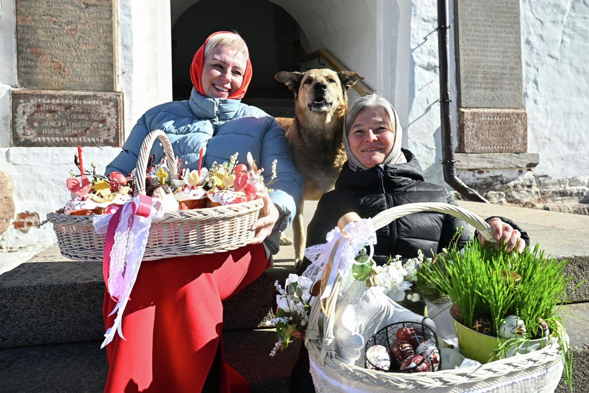 Верующие после освящения куличей на территории Спасо-Преображенского Соловецкого ставропигиального мужского монастыря на Соловках