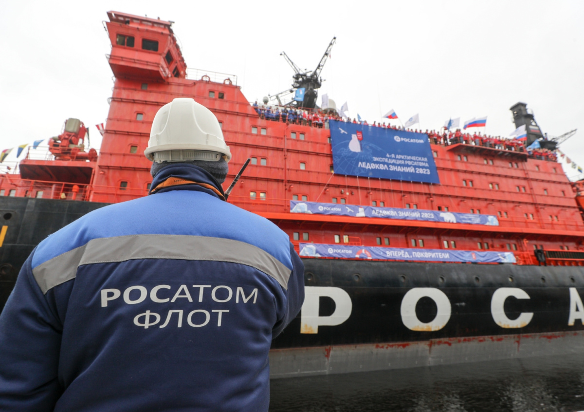 Капитан судна «50 лет Победы» Дмитрий Лобусов (в центре) и глава госкорпорации «Росатом» Алексей Лихачев (справа) во время церемонии завершения экспедиции «Ледокол знаний 2023»