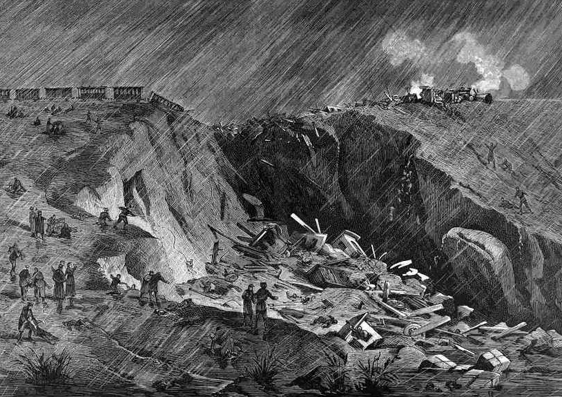 Причины катастрофы, как выяснилось потом, были до ужаса банальны. Подрядчик экономил на всём, на чём можно. И украл, конечно же, деньги при постройке дороги. Поэтому проложенная под песочной насыпью чугунная труба, которая должна была отводить воду, не справилась с напором во время серьёзного дождя. Насыпь размыло, и поезд рухнул в образовавшуюся пустоту. Разломанные вагоны, обломки рельсов, искореженные тела людей потащило в селевой поток.