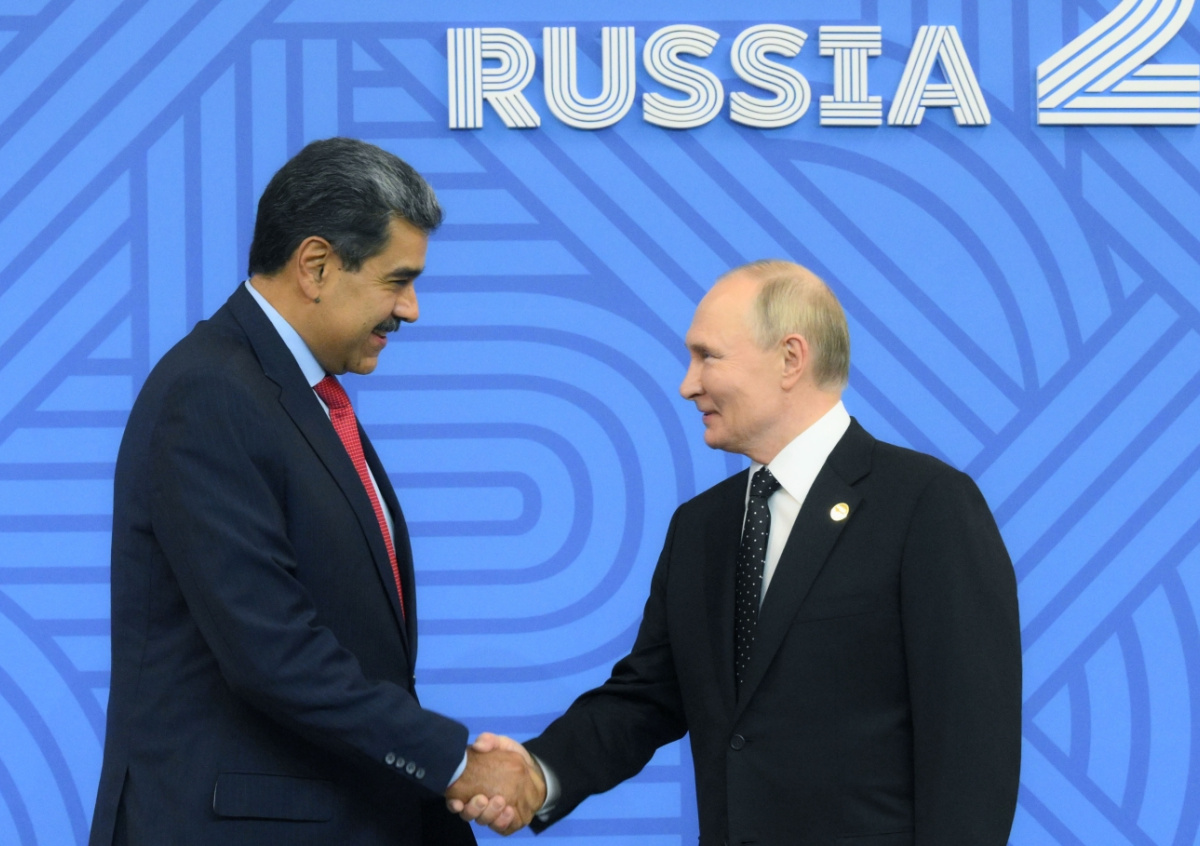 Владимир Путин и президент Венесуэлы Николас Мадуро (слева) на церемонии официальной встречи глав делегаций — участников XVI саммита БРИКС Владимир Путин и президент Венесуэлы Николас Мадуро (слева) на церемонии официальной встречи глав делегаций — участников XVI саммита БРИКС Фото: Фотохост-агентство brics-russia2024.ru/Сергей Бобылев
