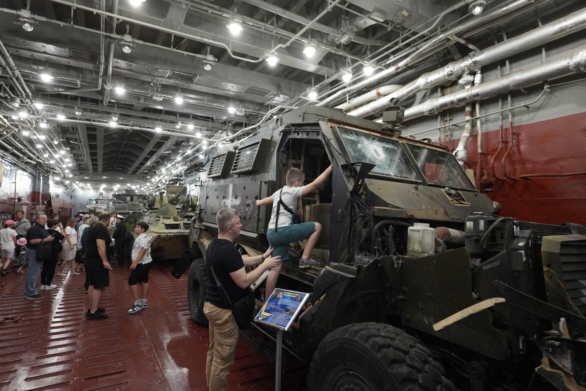 Посетители на борту большого десантного корабля «Иван Грен», где проходит выставка трофеев специальной военной операции, в Санкт-Петербурге