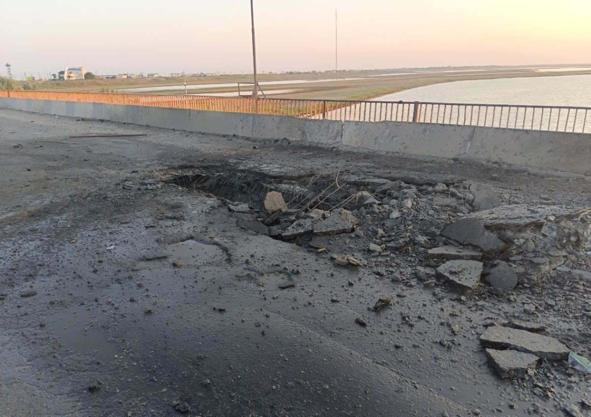 Последствия обстрела мостов на административной границе между Херсонской областью и Крымом вблизи Чонгара