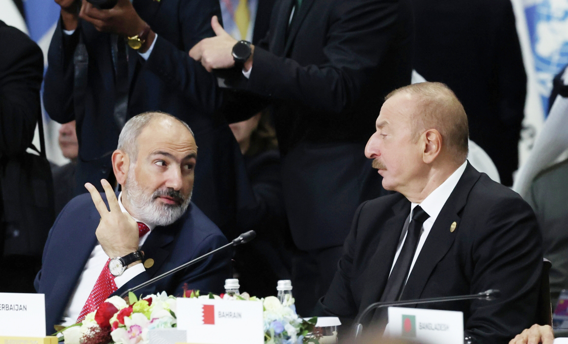 Никол Пашинян (слева) и президент Азербайджана Ильхам Алиев на пленарном заседании XVI саммита БРИКС в формате «аутрич» / «БРИКС плюс». Никол Пашинян (слева) и президент Азербайджана Ильхам Алиев на пленарном заседании XVI саммита БРИКС в формате «аутрич» / «БРИКС плюс». Фото: Александр Казаков/РИА Новости