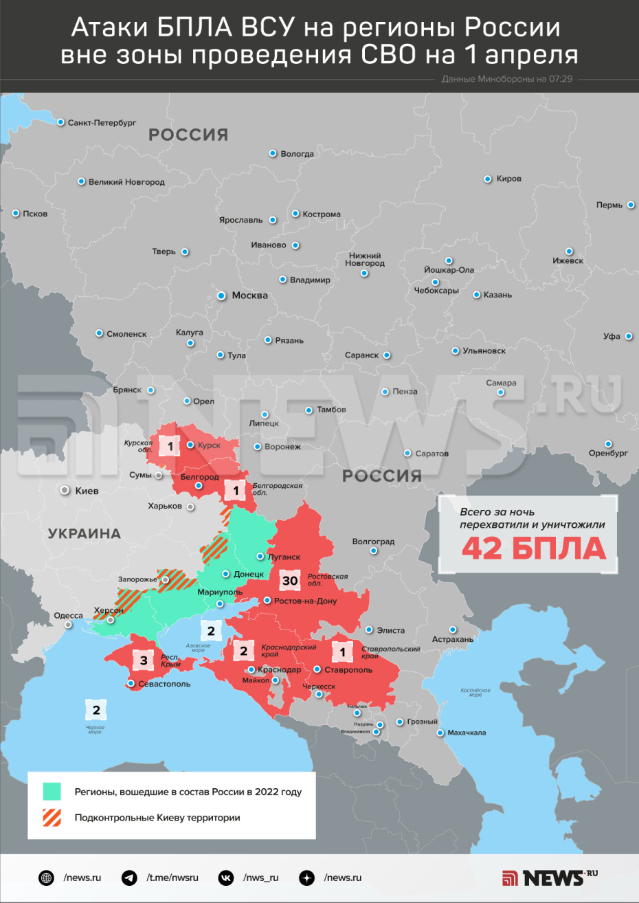В течение прошедшей ночи (c 20:00 мск 31 марта до 07:00 мск 1 апреля) дежурными средствами ПВО перехвачены и уничтожены 42 украинских беспилотных летательных аппарата самолетного типа, — сказано в сообщении.