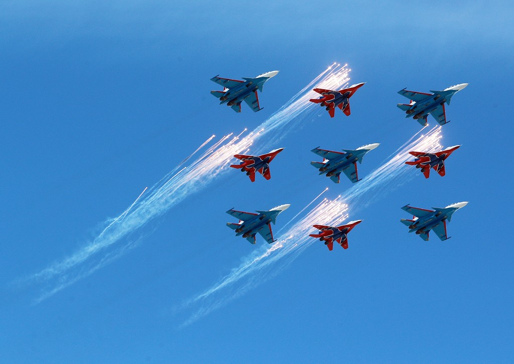 Кроме того, в рамках парада в честь празднования 79-й годовщины победы в Великой Отечественной войне пилотажные группы «Русские витязи» и «Стрижи» исполнили знаменитый «Кубинский бриллиант» над Красной площадью. В маневре приняли участие девять самолетов Су-30СМ и МиГ-29, группу возглавил полковник Андрей Алексеев.