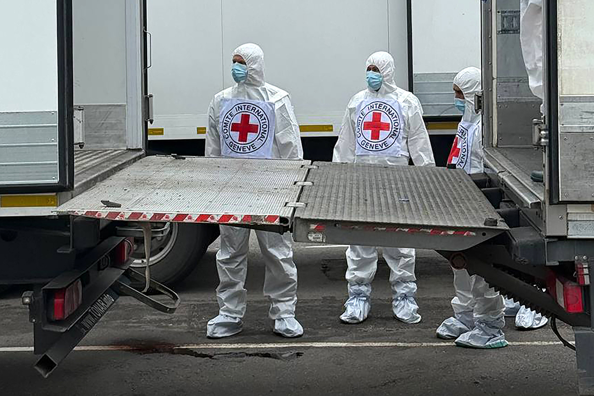 Также агентство поделилось кадрами, на которых зафиксировано несколько рефрижераторов с телами солдат ВСУ. Рядом с ними запечатлено большое количество человек в спецодежде.