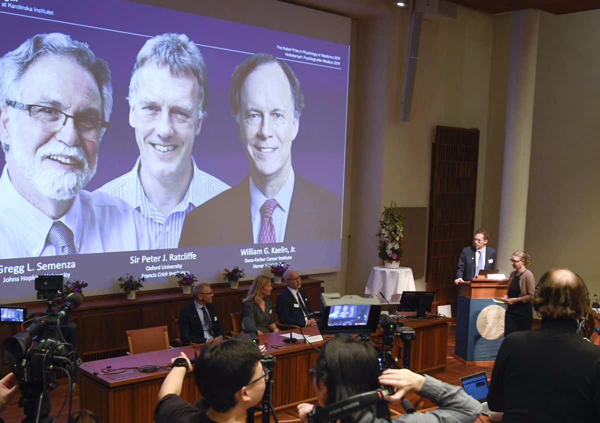 Нобелевский комитет при Каролинском медицинском институте объявил, что премию-2019 в области медицины и физиологии получили американский учёный Грэгг Л. Семенца из Университета Джона Хопкинса, британский учёный Питер Ратклифф из Оксфордского университета и онколог Уильям Кэлин из Гарвардского университета.