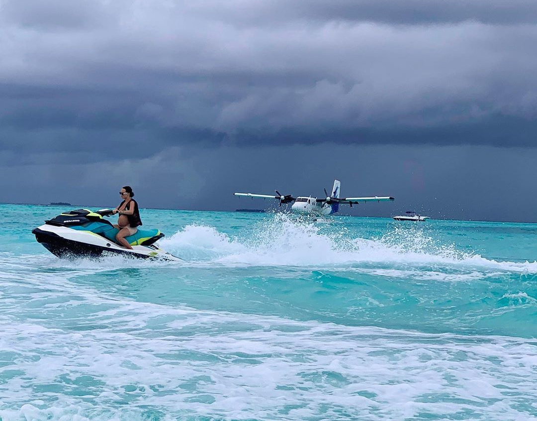 Невеста рэпера Тимати модель Анастасия Решетова, у которой примерно через месяц должен родиться ребёнок, устроила катание на гидроцикле на Мальдивах.